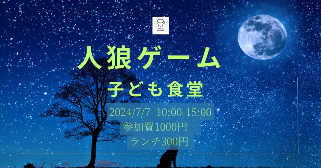 【人狼ゲーム&子ども食堂】 人間力を高めるボードゲームカフェ「リドル」 人狼ゲームを中心に、ゲームを通してコミュニケーション力を上げ、新たに人間関係を広げていくための力をつけることを目的として立ち上げた「リドル」。 コミュニケーション力、交渉力、説得力、理解力、想像力、話す聞く力・・・などなどが鍛えられます。 【内容】人狼ゲームを午前午後どちらも行います。大人も子どもも、初心者の方でも気軽に参加できます。 【日時】7月7日(日)10:00〜15:00 大人と子ども参加可能 【参加費】1000円 【子ども食堂】 大人500円 学生300円 【申し込みフォーム】 https://form.os7.biz/f/0b26cc4c/ 【場所】 カフェラコラボ cafe la Collabo 札幌市中央区南1条西17丁目1−18 白樺ビル1階 【ファシリテーター】小森先生 【主催】子どもの生きる力をつけるALL de Collabo 【問合先】カフェラコラボ 金山 cafelacollabo39@gmail.com